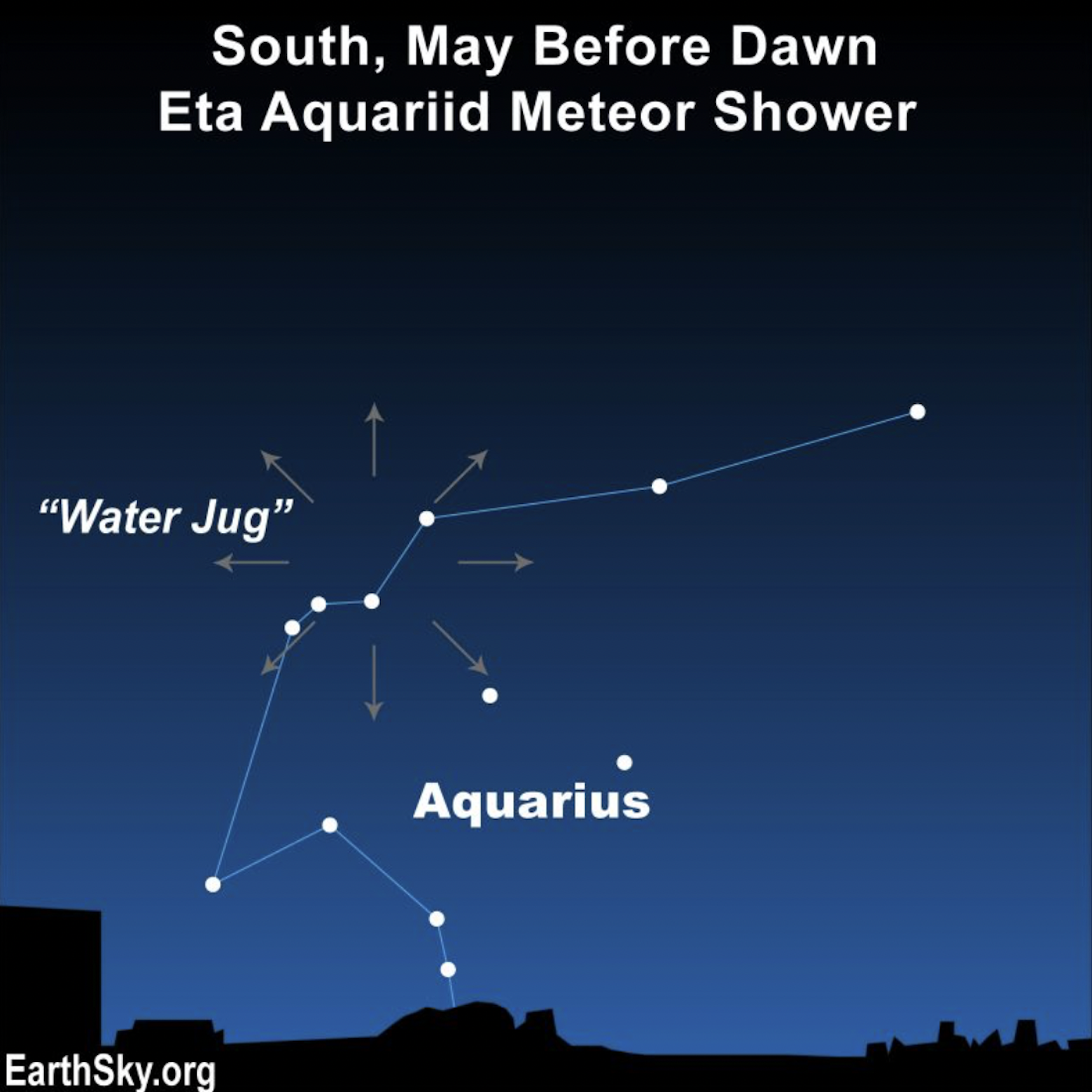 The radiant point of the Eta Aquariid meteor shower is near the star Eta Aquarii in the constellation Aquarius the Water Bearer.