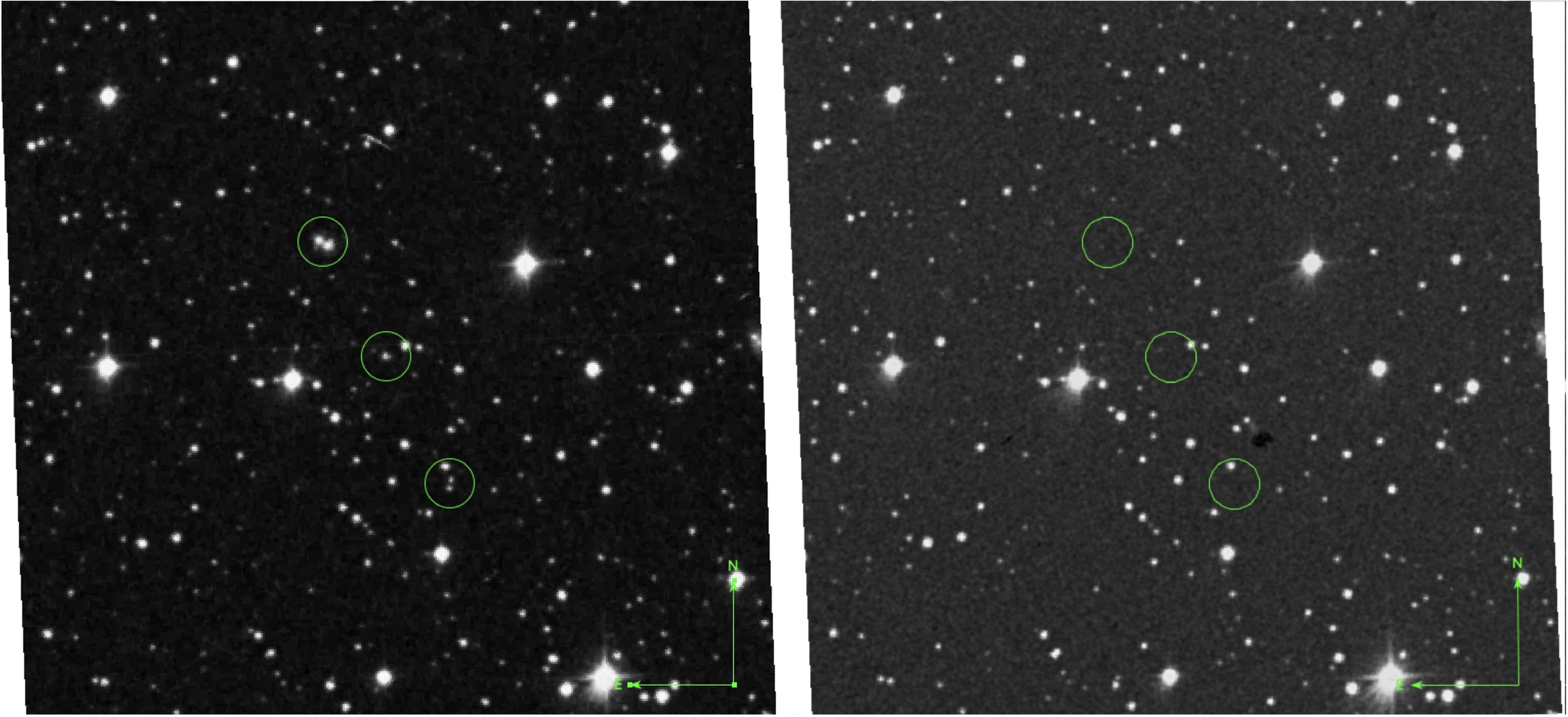 View larger. | Transient flashes – momentary light bursts, circled in green – seen in a digitized astronomical plate from the Palomar Sky Survey on July 27, 1952. Note that the transients disappear in the 2nd image. Image via Villarroel et al./ Publications of the Astronomical Society of the Pacific.